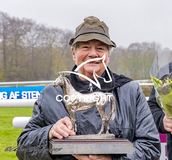 - Billede Beskrivelse: GREY FLASH med Carlos Lopez 1. løbs vinder af Basnæsløb 2019, på Klampenborg d. 2019-11-02. Her Lone Kaj-Nielsen med ærespræmien. Photo: Burt Seeger.