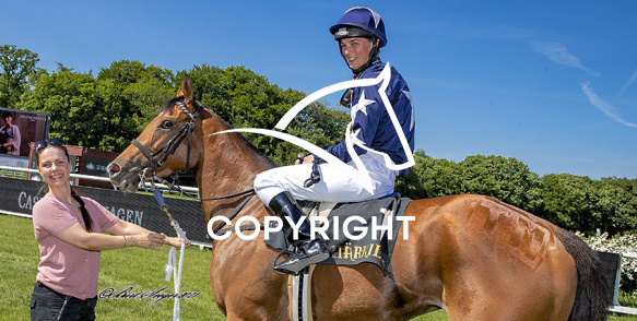 - Beskrivelse: TARGARYEN med Maria Jørgensen 6. løbs vinder, her sammen med træner Tina Mortensen, på Klampenborg d. 2021-06-05. Photo: Burt Seeger.