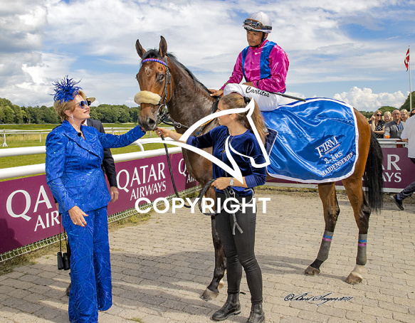 - Billede Beskrivelse: LADY MONROE med Carlos Lopez 1. løbs vinder på Klampenborg d. 2021-08-08. Photo: Burt Seeger.