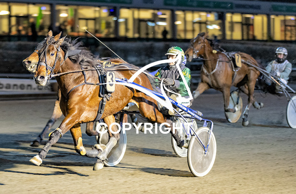 - Billede Beskrivelse: EMIREN K med Michael Appelt Nielsen 7. løbs vinder på Charlottenlund d. 2023-02-17. Photo: Burt Seeger.