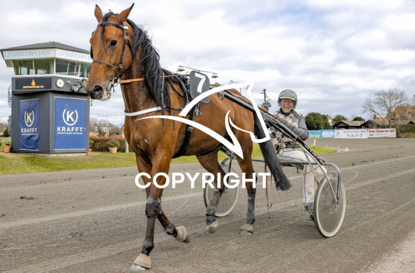 - Billede Beskrivelse: GANGSTER SIMONI med Axel Jacobsen 6. løbs vinder på Charlottenlund d. 2023-02-25. Photo: Burt Seeger.