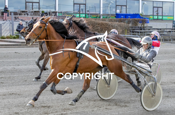 - Billede Beskrivelse: GANGSTER SIMONI med Axel Jacobsen 6. løbs vinder på Charlottenlund d. 2023-02-25. Photo: Burt Seeger.