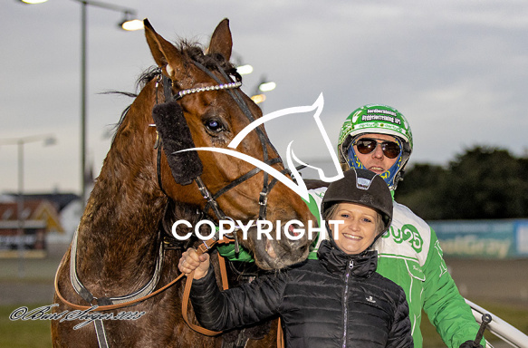 - Billede Beskrivelse: ALVIN C G med Rene Kjær 6. løbs vinder på Charlottenlund d. 2023-03-17. Photo: Burt Seeger.