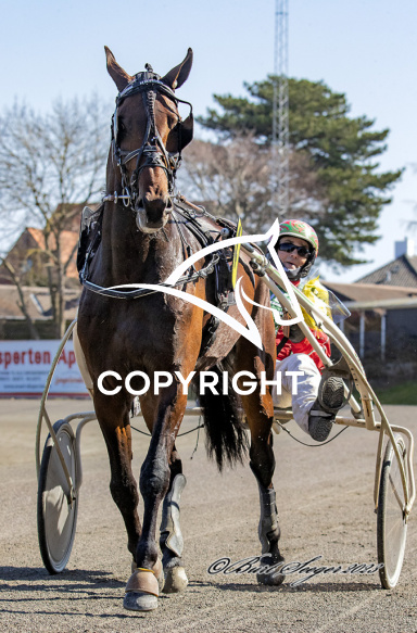 - Billede Beskrivelse: HAMISH med Steen Juul 1. løbs vinder på Charlottenlund d. 2023-04-08. Photo: Burt Seeger.