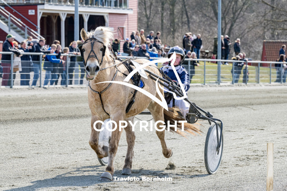 - Beskrivelse: Skovgårets Baldo med Julie Sjøholm Jensen Bornholms Brand Park 10. april 2023 Fotograf Torben Ager - Travfoto Bornholm