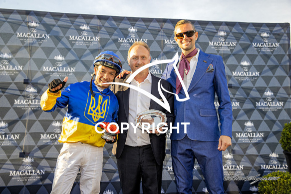 - Billede Beskrivelse: SLAVA UKRAINI med Carlos Lopez 10. løbs vinder af THE MACALLAN DANSK DERBY 2023, på Klampenborg d. 2023-08-05. Photo: Burt Seeger.