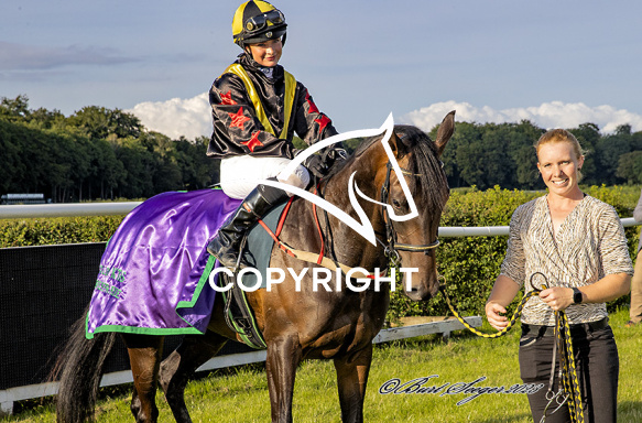 - Beskrivelse: COLUMBIA med Hedda Nexbo 9. løbs vinder på Klampenborg d. 2023-08-05. Photo: Burt Seeger.