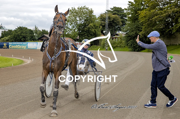 - Beskrivelse: HELENA D D med Jeppe Rask 5. løbs vinder på Charlottenlund d. 2023-08-11. Photo: Burt Seeger.
