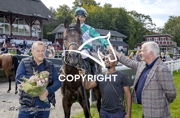 - Beskrivelse: IRISH FIRE med Elione Chaves 4. løb vinder på Klampenborg d. 2023-09-16. Photo: Burt Seeger.