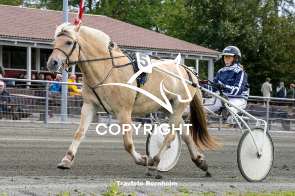 - Beskrivelse: Skovgærets Baldo med Julie Sjøholm Jensen Bornholms Brand Park 7 oktober 2023 Fotograf Torben Ager - Travfoto Bornholm