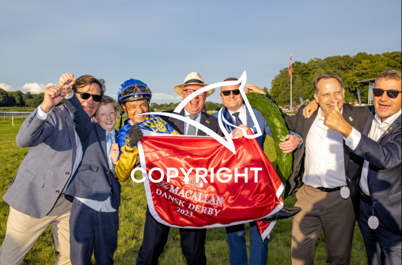 - Billede Beskrivelse: SLAVA UKRAINI med Carlos Lopez 10. løbs vinder af THE MACALLAN DANSK DERBY 2023, på Klampenborg d. 2023-08-05. Photo: Burt Seeger.