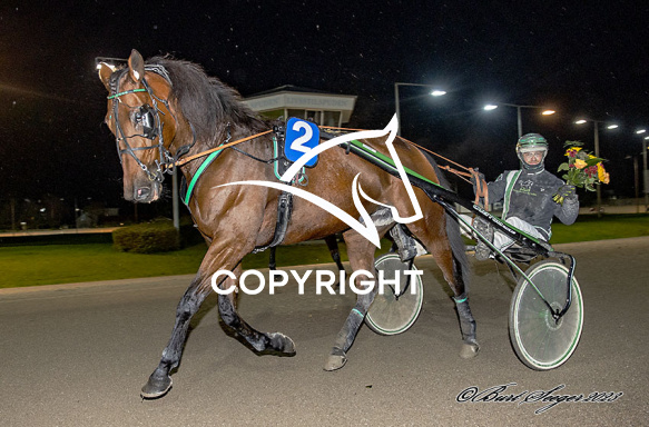 - Billede Beskrivelse: KATHY GRAGON med Victor Ecce 2. løbs vinder på Charlottenlund d. 2023-10-26. Photo: Burt Seeger.