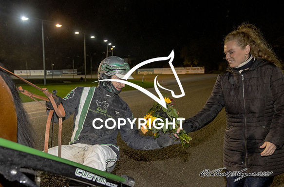 - Billede Beskrivelse: KATHY GRAGON med Victor Ecce 2. løbs vinder på Charlottenlund d. 2023-10-26. Photo: Burt Seeger.