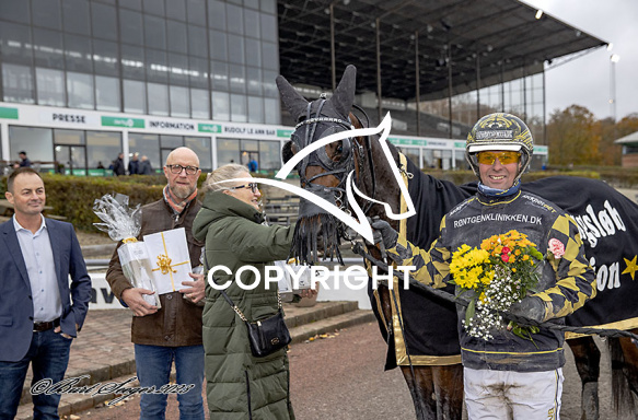 - Billede Beskrivelse: KINGSTON FLAMINGO med Birger Jørgensen 5. løbs vinder af Opdrætningsløb Consolation 2023, på Charlottenlund d. 2023-11-05. Photo: Burt Seeger.