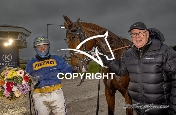 - Billede Beskrivelse: HOLGER J J med Preben Kjærsgaard 3. løbs vinder på Charlottenlund d. 2023-12-10. Photo: Burt Seeger.