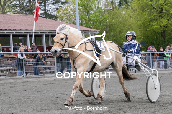 - Billede Beskrivelse: Skovgærets Baldo med Julie Sjøholm Jensen Bornholms Brand Park 10 maj 2024 Fotograf Torben Ager - Travfoto Bornholm