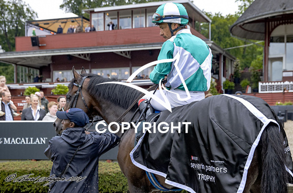 - Beskrivelse: IRISH FIRE med Carlos Lopez 7. løbs vinder på Klampenborg d. 2024-06-15. Photo: Burt Seeger.