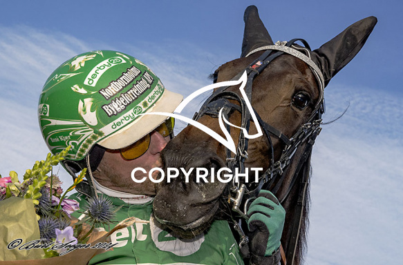 - Billede Beskrivelse: KARMA SHADOW med Rene Kjær 9. løbs vinder af Derby Prøve, på Charlottenlund d. 2024-08-23. Photo: Burt Seeger.
