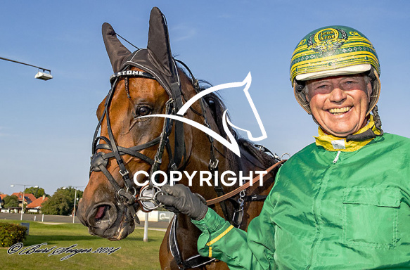 - Billede Beskrivelse: IDEAL STONE med Jens Arne Hansen 6. løbs vinder, på Charlottenlund d. 2024-09-03. Photo: Burt Seeger.