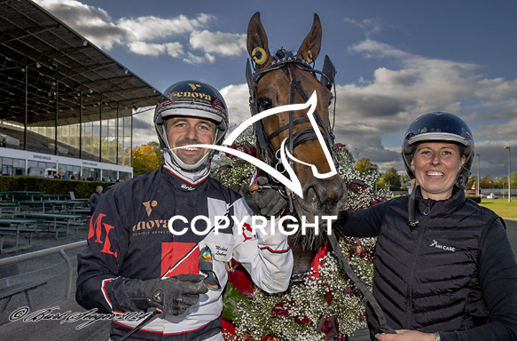 - Billede Beskrivelse: KARAT C N med Michael Lønborg 7. løbs vinder, af Dansk Trav Kriterium 2024, på Charlottenlund d. 2024-10.06. Photo: Burt Seeger.