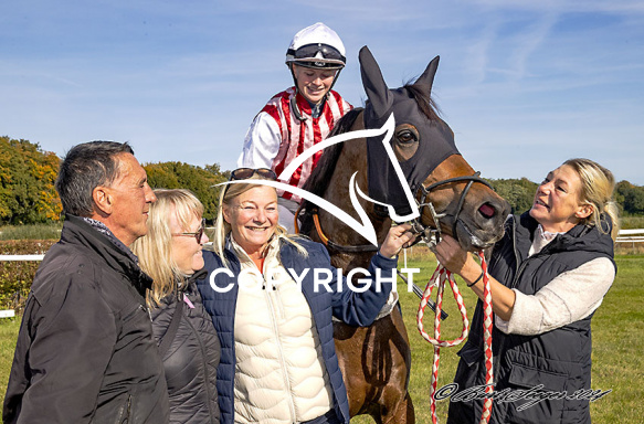 - Beskrivelse: TOO DARN EASY med Annie Nilsson-Lindahl 2. løbs vinder på Klampenborg d. 2024-10-12. Photo: Burt Seeger.