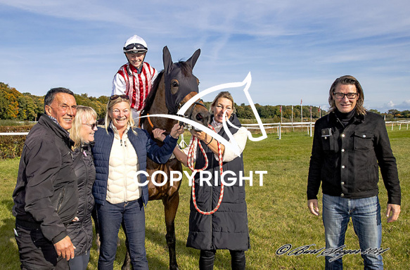 - Beskrivelse: TOO DARN EASY med Annie Nilsson-Lindahl 2. løbs vinder på Klampenborg d. 2024-10-12. Photo: Burt Seeger.