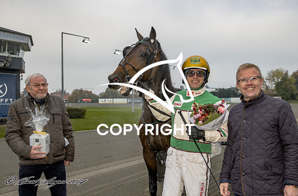 - Billede Beskrivelse: LUIGI med Jeppe Juel 2. løbs vinder, på Charlottenlund d. 2024-10.-25. Photo: Burt Seeger.