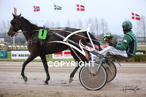 - Beskrivelse: GAIA ULKÆR med Mathias Jensen vinder dagens 9. løb på Spar Nord Arena-Aalborg Væddeløbsbane d. 7/12-2024. Fotograf: Hesselborg Foto