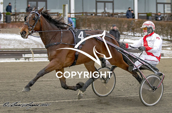 - Billede Beskrivelse: GIGGLER med Henrik Thomsen 6. løbs vinder, på Charlottenlund d. 2025-01-05. Photo: Burt Seeger.