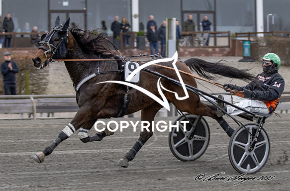 - Billede Beskrivelse: BORDEAUX FACE med Rene Kjær 5. løbs vinder, på Charlottenlund d. 2025-01-19. Photo: Burt Seeger.