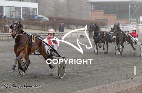 - Billede Beskrivelse: GIGGLER med Henrik Thomsen 7. løbs vinder, på Charlottenlund d. 2025-01-19. Photo: Burt Seeger.