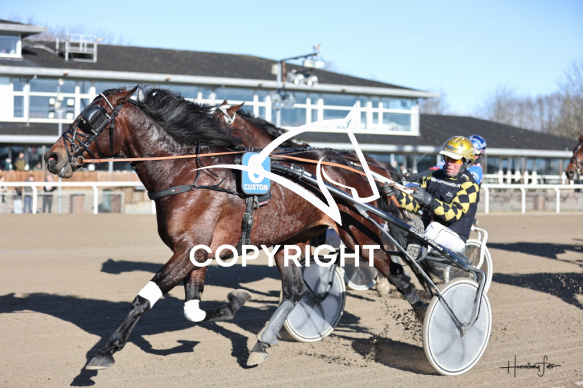 - Beskrivelse: DONTGETINMYWAY med Birger Jørgensen vinder dagens 2 lunch løb. (Amrikanerløb) her på Spar Nord Arena-Aalborg Væddeløbsbane d. 17/2-2025. Fotograf: Hesselborg Foto