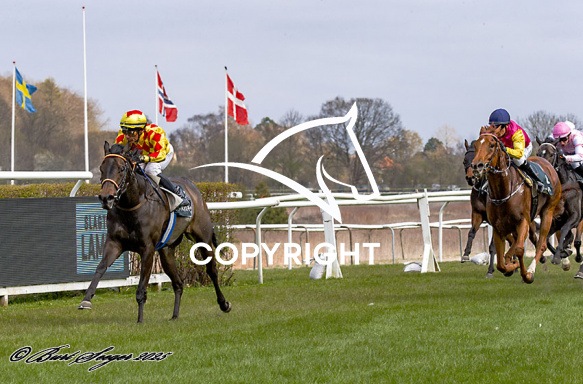 - Beskrivelse: FIRST med Carlos Lopez 3. løbs vinder på Klampenborg d. 2024-04-12. Photo: Burt Seeger.
