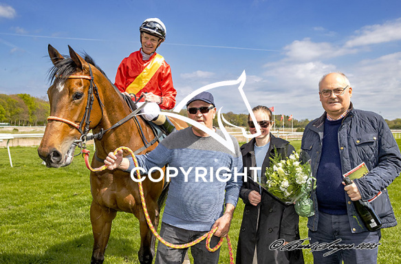 - Billede Beskrivelse: DIMITRIA med Jacob Johansen 1. løbs vinder på Klampenborg d. 2024-04-26. Photo: Burt Seeger.
