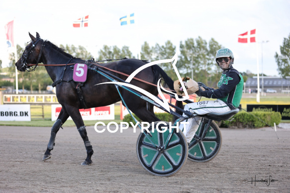 - Beskrivelse: JUST TIME med Nicklas Korfitsen vinder dagens 8 løb. Spar Nord Arena-Aalborg Væddeløbsbane d. 26/5-2025. Fotograf: Hesselborg Foto