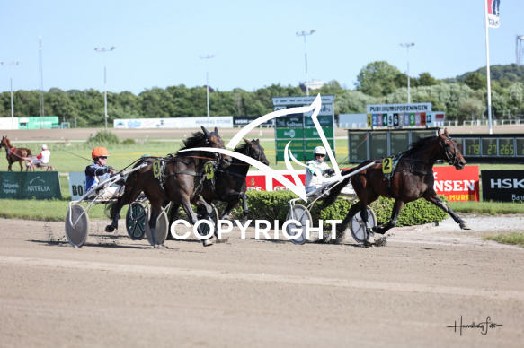 - Beskrivelse: KINGS DUST med Flemming Jensen vinder dagens 1 løb her på Spar Nord Arena-Aalborg Væddeløbsbane d. 11/6-2025. Fotograf: Hesselborg Foto
