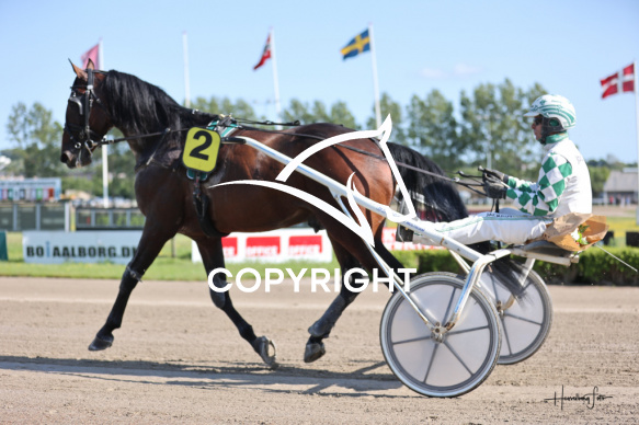 - Beskrivelse: KINGS DUST med Flemming Jensen vinder dagens 1 løb her på Spar Nord Arena-Aalborg Væddeløbsbane d. 11/6-2025. Fotograf: Hesselborg Foto