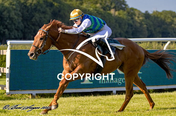 - Billede Beskrivelse: TOM COLLINS med Evelina Rönnlund 3. løbs vinder på Klampenborg d. 2024-06-13. Photo: Burt Seeger.