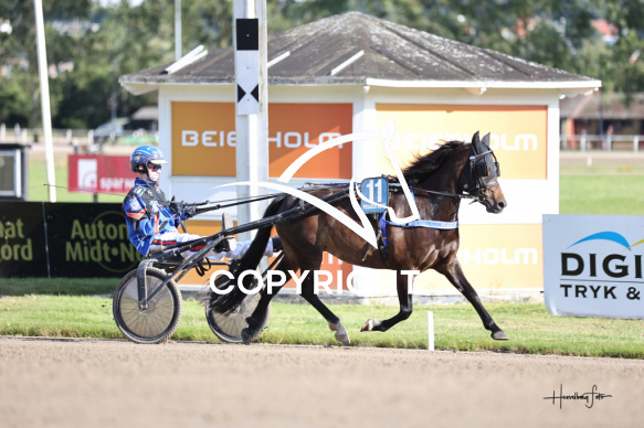 - Beskrivelse: BLACK STAR med Vilja Søndergaard Larsson vinder dagens ponyløb. Ponyløb. Spar Nord Arena-Aalborg Væddeløbsbane d. 11/7-2025. Fotograf: Hesselborg Foto