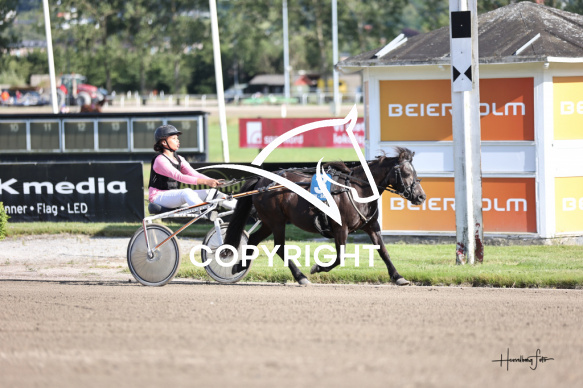 - Beskrivelse: BLACK STAR med Vilja Søndergaard Larsson vinder dagens ponyløb. Ponyløb. Spar Nord Arena-Aalborg Væddeløbsbane d. 11/7-2025. Fotograf: Hesselborg Foto