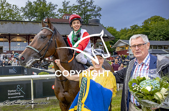 - Billede Beskrivelse: TRUE DANE med Mikkel Mortensen 5. løbs vinder på Klampenborg d. 2024-07-11. Photo: Burt Seeger.