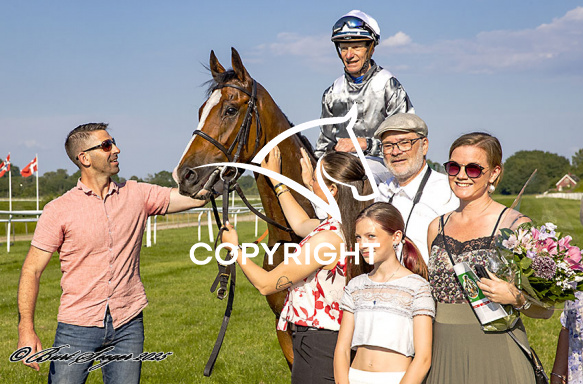 - Billede Beskrivelse: HI KITTY med Jacob Johansen 3. løbs vinder på Klampenborg d. 2024-07-19. Photo: Burt Seeger.