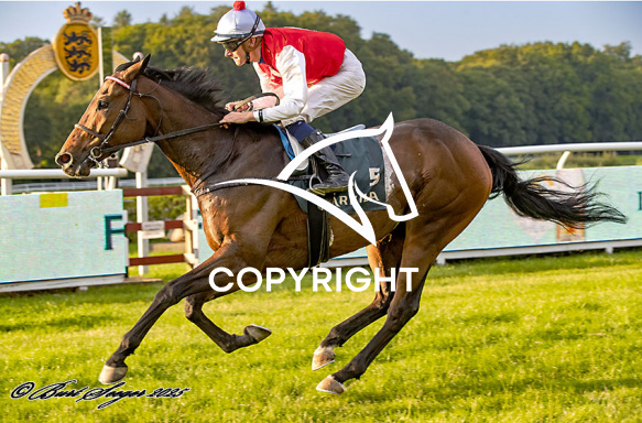 - Billede Beskrivelse: LUCIEN med Jacob Johansen 8. løbs vinder på Klampenborg d. 2024-07-19. Photo: Burt Seeger.