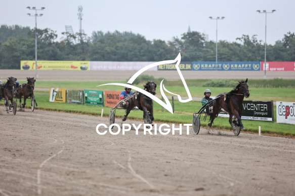 - Beskrivelse: GHINA D SLEIPNER med Frederik Kragh Olsen vinder dagens 7 løb. Formløb Amatør/Jockey Spar Nord Arena-Aalborg Væddeløbsbane d. 21/7-2025. Fotograf: Hesselborg Foto