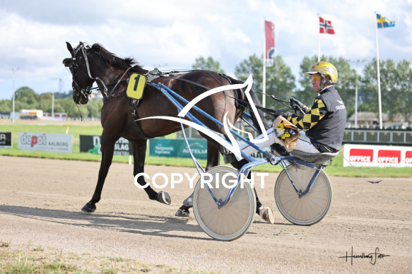 - Beskrivelse: GUNPOWDER med Birger Jørgensen vinder dagens 1 løb. Amerikanerløb Spar Nord Arena-Aalborg Væddeløbsbane d. 30/7-2025. Fotograf: Hesselborg Foto