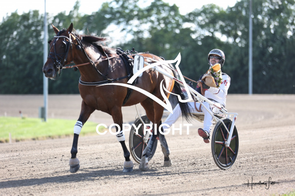 - Beskrivelse: KLEOPATRA S F med Michael Lønborg vinder dagens 5 løb. Amerikanerløb Spar Nord Arena-Aalborg Væddeløbsbane d. 30/7-2025. Fotograf: Hesselborg Foto