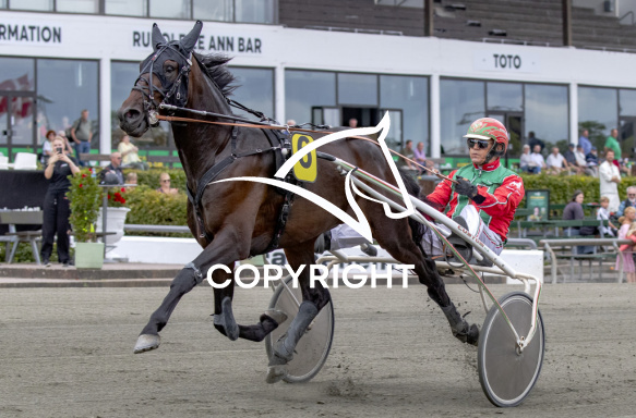 - Beskrivelse: LEMMY med Steen Juul 1. løbs vinder, på Charlottenlund d. 2025-07-27. Photo: Burt Seeger.