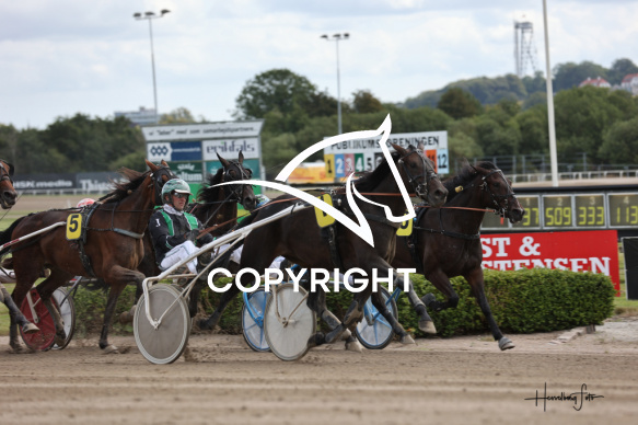 - Beskrivelse: JUST TIME med Jan Dahlgaard vinder dagens 1 løb. DM for Professionelle Travtrænere 2025 (7. afd.) - Amerikanerløb Spar Nord Arena-Aalborg Væddeløbsbane d. 9/8-2025. Fotograf: Hesselborg Foto