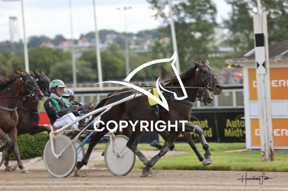 - Beskrivelse: JUST TIME med Jan Dahlgaard vinder dagens 1 løb. DM for Professionelle Travtrænere 2025 (7. afd.) - Amerikanerløb Spar Nord Arena-Aalborg Væddeløbsbane d. 9/8-2025. Fotograf: Hesselborg Foto