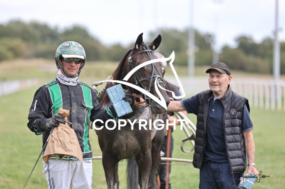- Beskrivelse: JUST TIME med Jan Dahlgaard vinder dagens 1 løb. DM for Professionelle Travtrænere 2025 (7. afd.) - Amerikanerløb Spar Nord Arena-Aalborg Væddeløbsbane d. 9/8-2025. Fotograf: Hesselborg Foto
